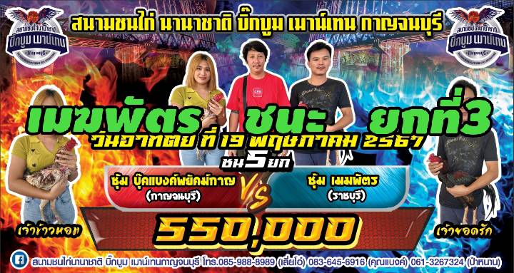 สนามชนไก่มหาลาภ ล้วนแต่เป็นไก่ชนเงินล้าน ท่านใดชื่นชอบไก่ชนไม่ควรพลาดโอกาสนี้ โดยคู่เด็ดประจำวัน ไก่ชนคู่เอก เก้าเจริญ88VSมาบยาทัวร์ ชิงรางวัลเงินเดิมพัน5,500,000บาท คู่ที่2 ซุปเปอร์บอลVSเมฆพัตร ชิงรางวัลเงินเดิมพัน2,200,000บาท คู่ที่ แปดจอมยุทธVSลูกชาวไร่ ชิงรางวัลเงินเดมพัน1,100,000บาท คู่ที่4 วัยรุ่นซุ้มไก่VSอ.บุญรัตน์ ชิงรางวัลเงินเดิมพัน1,100,000บาท