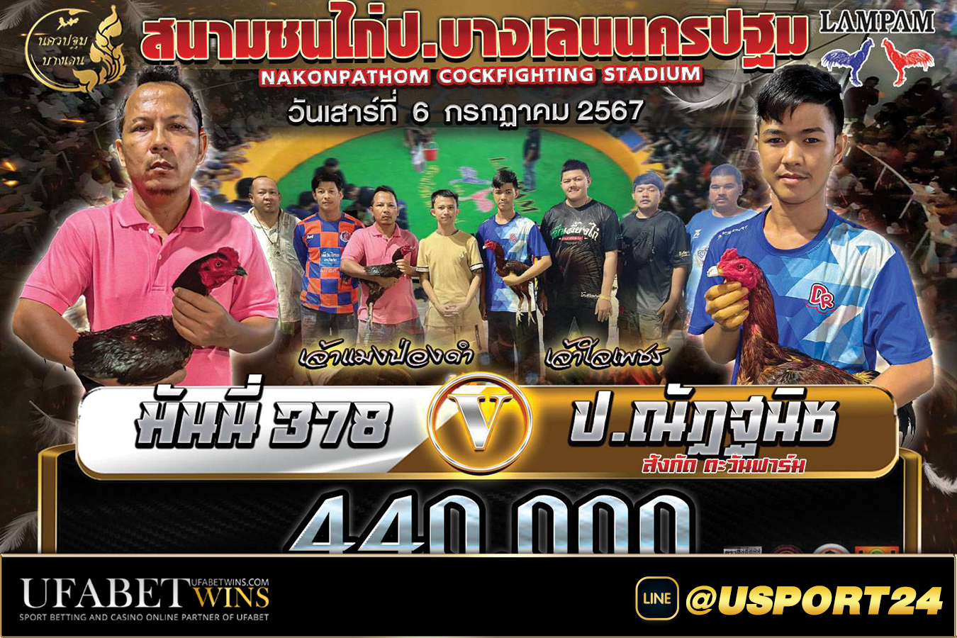สนามชนไก่นครปฐมบางเลน คู่ไก่ชนที่พร้อมชน คู่เอก สุดสาครVSซามูไร ชิงรางวัลเงินเดิมพัน2,200,000บาท คู่ที่2 เขี้ยวราชสีห์VSท่าช้างใต้ ชิงรางวัลเงินเดิมพัน1,100,000บาท คู่ที่3 มังกรแปดริ้วVSเด็กปั้ม ชิงรางวัลเงินเดิมพัน1,100,000บาท คู่ที่4 สามตุ่มทองVSน้องโชกุล ชิงรางวัลเงินเดิมพัน660,000บาท