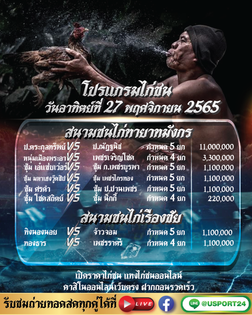 โปรแกรมไก่ชน วันเสาร์ ที่ 27 พฤศจิกายน 2565