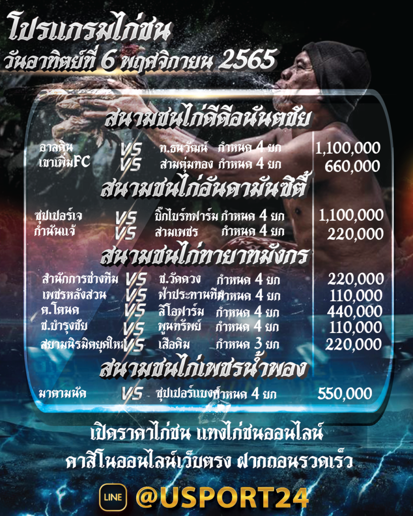 โปรแกรมไก่ชน วัน อาทิตย์ ที่ 6 พฤศจิกายน 2565